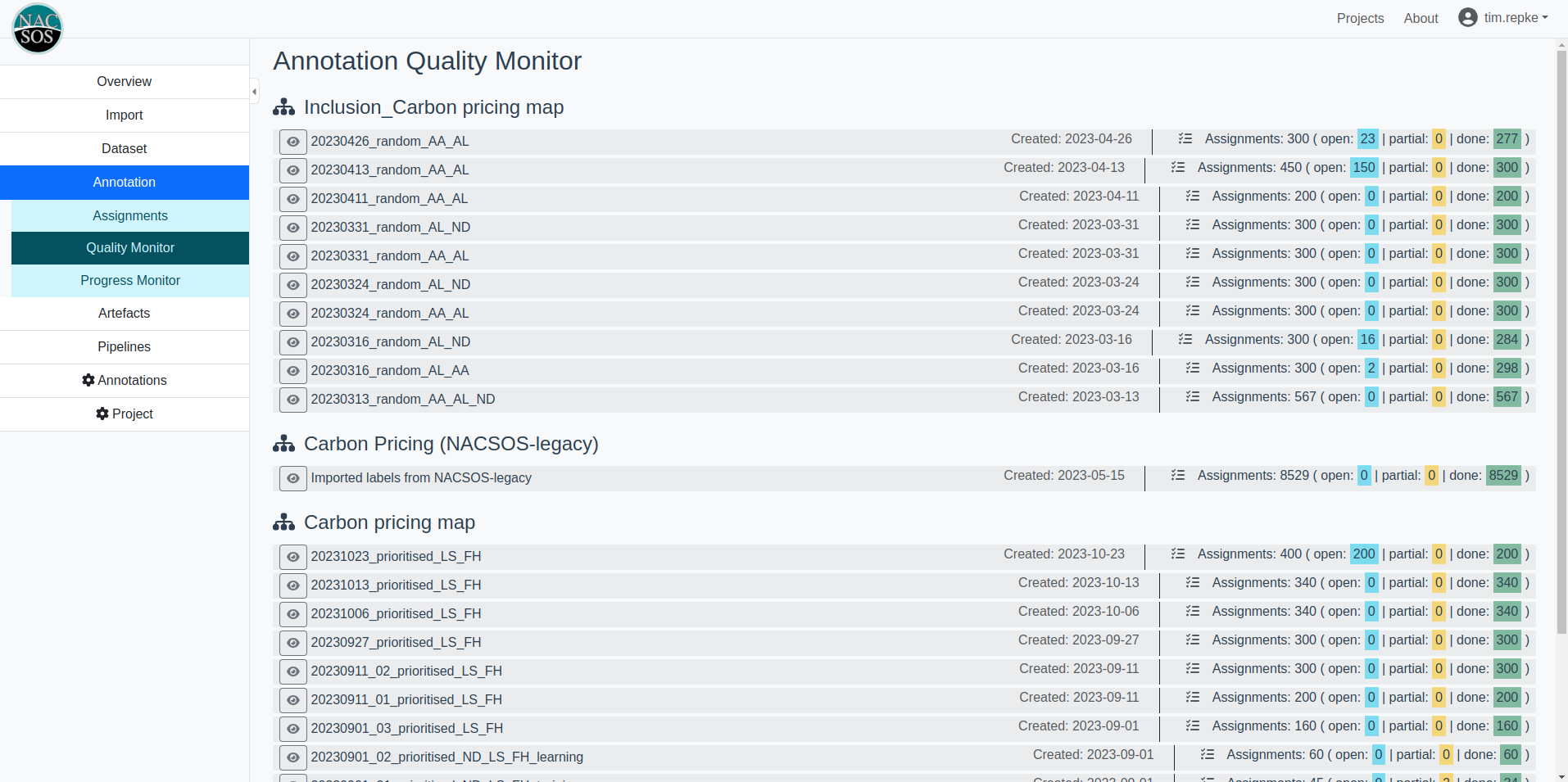 You may wish to see how far annotators have progressed with the assignments and how well they agree. This information is available via "Annotation" -> "Quality Monitor" and at the bottom of each assignment scope config page.
