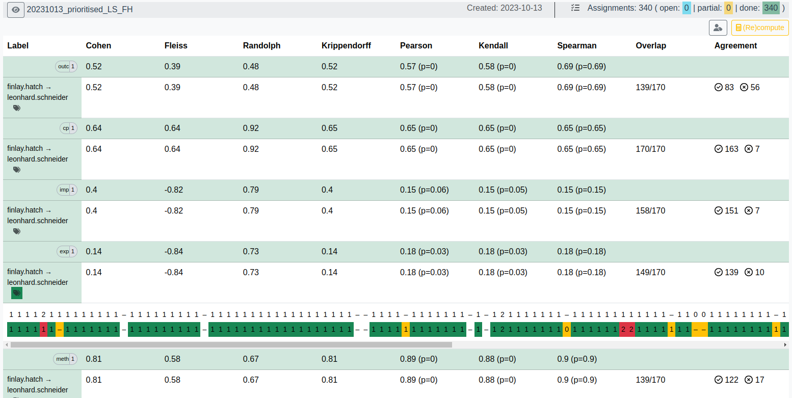 The rows with the green background (starting with the label) are averages of scores for all pairs of annotators unless the respective score can handle multiple annotators. You may see a label more than once, this can happen when your annotation scheme allows repeats. To save space, we do not display the full label hierarchy path (as for example in the resolution screen), but only the last key.