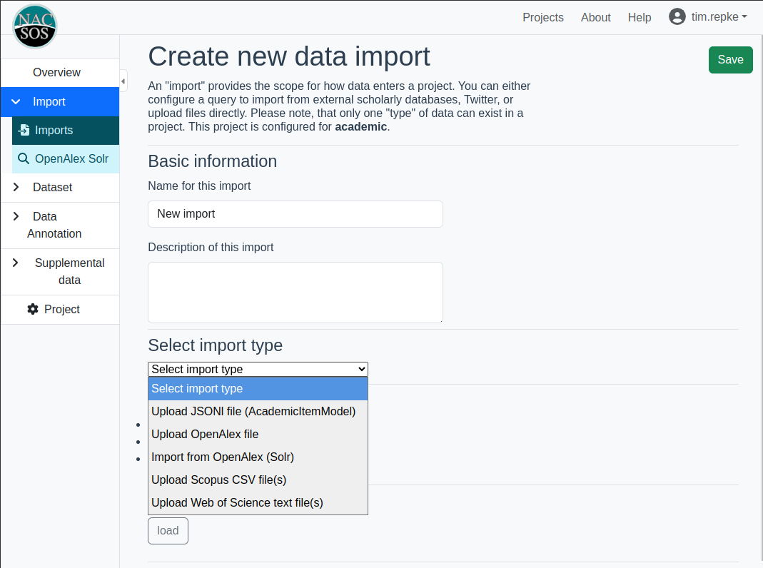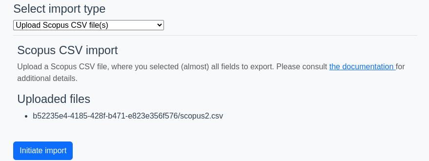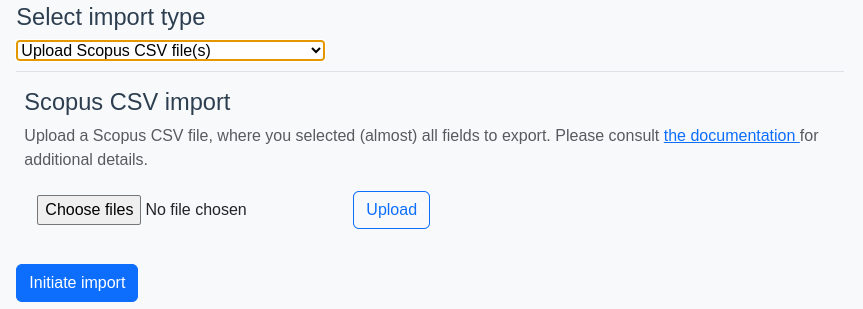 The most common imports are OpenAlex (solr), Scopus (CSV), and Web of Science (text). Please refer to the respective detail pages in this documentation for details on how to do so.