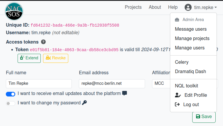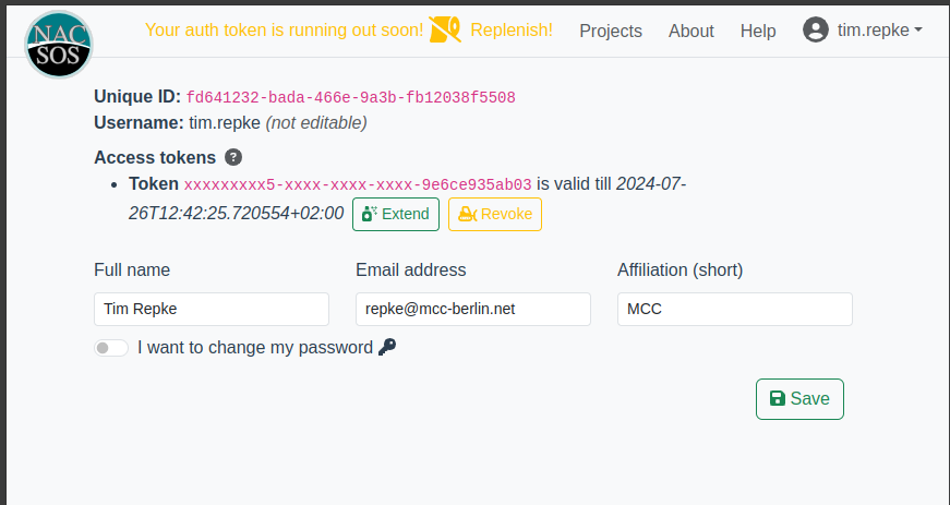 Also, any token is not valid forever and is usually invalid after two weeks. The platform will typically warn you about this so you can extend it (see figure above; click on replenish, then extend). Of course, you can simply log in again when things stop working.